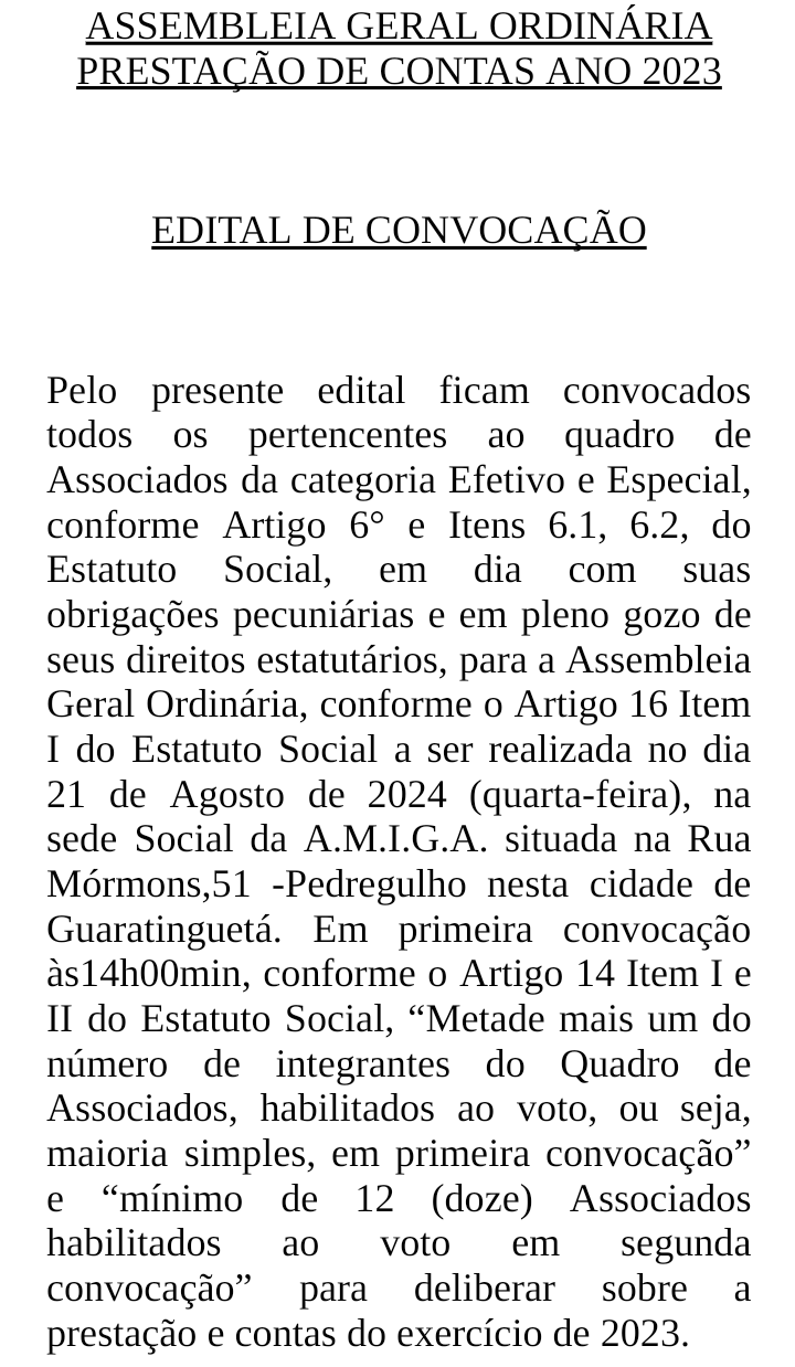 Início Notícias Guará A.M.I.G.A: EDITAL DE CONVOCAÇÃO – ASSEMBLÉIA GERAL ORDINÁRIA NotíciasGuará A.M.I.G.A: EDITAL DE CONVOCAÇÃO – ASSEMBLÉIA GERAL ORDINÁRIA 01/08/2024 326 0 FacebookTwitterPinterestWhatsAppPrint