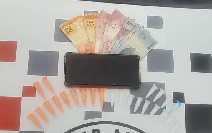 Durante a abordagem foram localizados uma quantia de R$27,00 reais em espécie. Já, na sacola descartada, os policiais encontraram 24 porções de cocaína e mais R$40,00 reais em dinheiro.