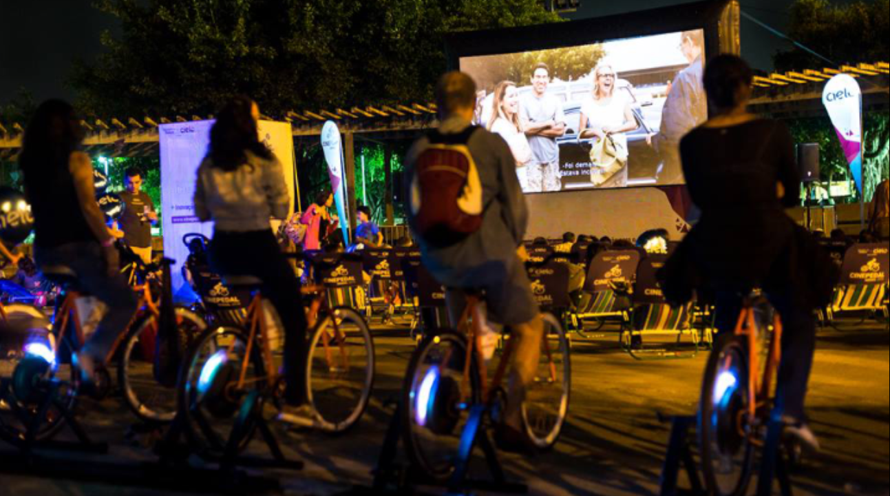 O público pode escolher de onde assistir aos filmes: acomodados na plateia de cadeiras ou pedalando nas estações de bicicletas, participando ativamente.