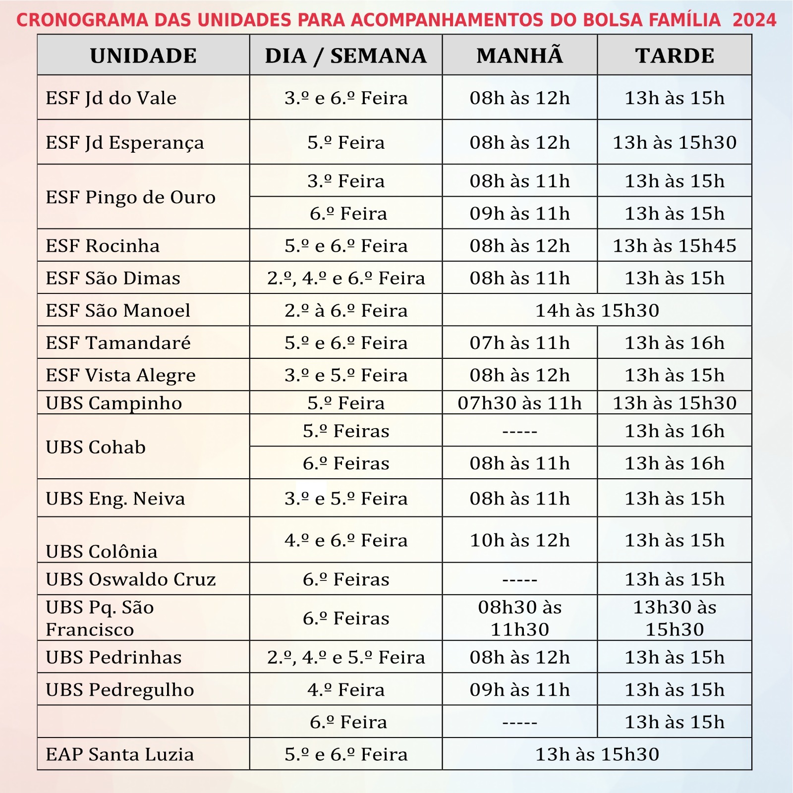 Os acompanhamentos serão realizados de 11 de março a 04 de maio. Os beneficiários devem procurar a unidade de saúde do seu bairro de acordo com o cronograma.