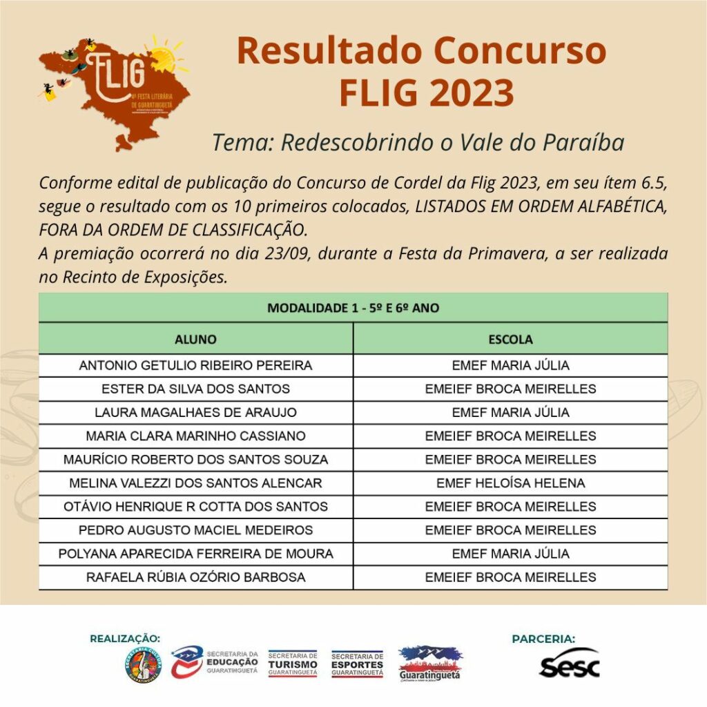 Na última sexta-feira (25), a Prefeitura por meio das Secretarias da Educação e Cultura divulgou a lista de alunos que serão premiados do concurso de poesia da 4ª edição da FLIG (Feira Literária de Guaratinguetá), que teve como tema “Literatura e História: Repensando o Vale Histórico”. O evento buscou reconhecer o trabalho dos alunos e professores, assim como o engajamento pela escrita que trouxe inspiração e sensibilidade de todos que participaram.