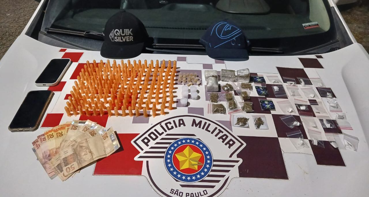 Com os abordados, os policiais localizaram certa quantia em dinheiro, além de diversas porções de drogas, entre elas maconha, crack e cocaína, bem como dois aparelhos celulares, que possivelmente eram utilizados na atividade criminosa.