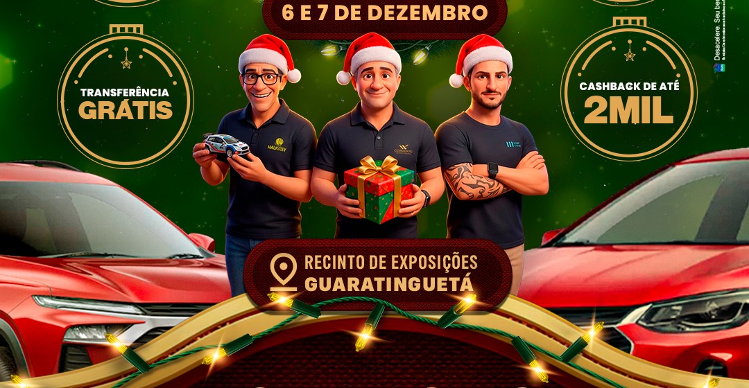 Transferência grátis para veículos adquiridos no evento. O cashback será de R$1.000,00 para carros até R$60.000,00, R$1.500,00 para carros de R$60.001,00 a R$100.000,00 e R$2.000,00 para carros acima de R$100.000,00, pago via Pix após a finalização do financiamento.