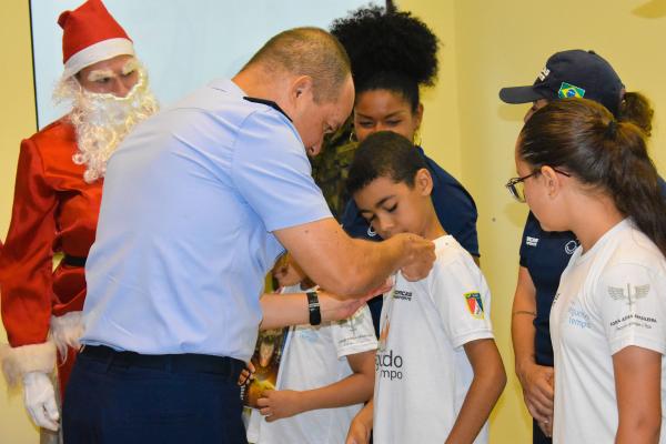 Um dos momentos mais marcantes foi a premiação dec cinco crianças que se destacaram ao longo do ano. Elas receberam das mãos do Comandante um broche de “Aluno Padrão”, como reconhecimento pelo desempenho e comportamento exemplar. A exibição de um vídeo com momentos das atividades desenvolvidas ao longo do ano trouxe ainda mais emoção à cerimônia.