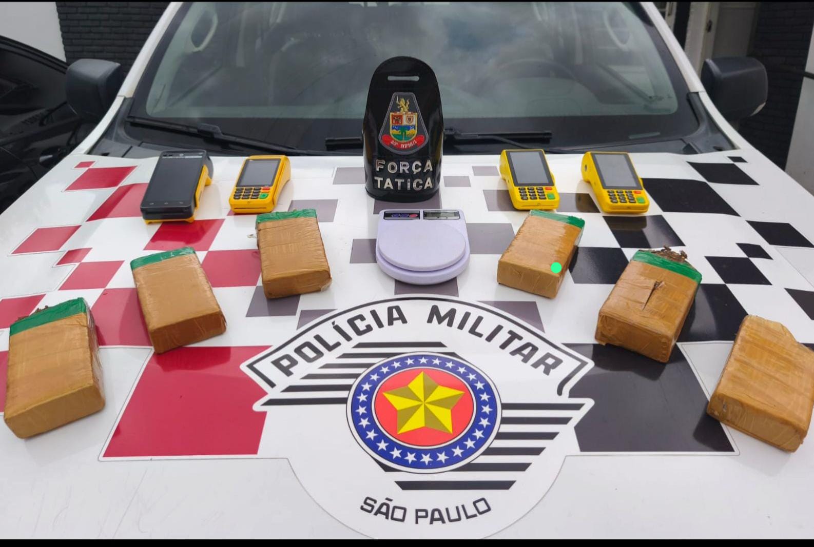 No interior do imóvel, os policiais localizaram seis pedaços de substância aparentando ser maconha, totalizando aproximadamente 3 quilos da droga, além de quatro maquininhas de cartão e uma balança de precisão, indicando possível atividade de tráfico.