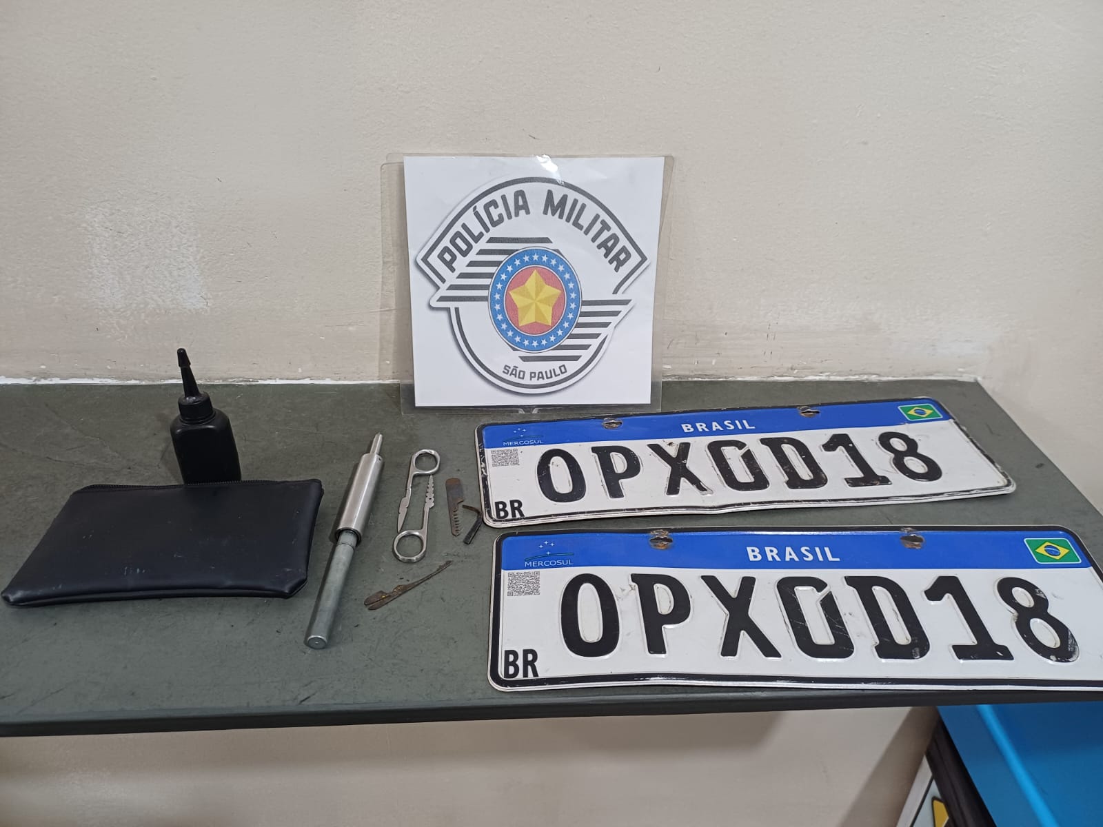 Ao ser questionado sobre o motivo do veículo estar ostentando placas diferentes, ele informou que um dos indivíduos que estava com ele sugeriu que ele trocasse as placas para trafegar tranquilamente sem ser multado. Os policiais realizaram buscas dentro do automóvel e localizaram as placas originais embaixo do tapete e uma chave mixa dentro do porta-luvas.