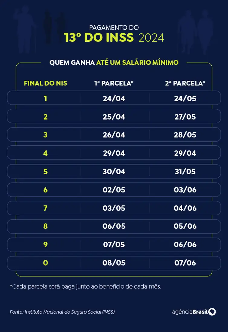 Os aposentados e pensionistas do Instituto Nacional do Seguro Social (INSS) começam a receber nesta quarta-feira (24) a antecipação do décimo terceiro. Até 8 de maio, mais de 33,6 milhões de segurados receberão a primeira parcela, que será paga conforme o dígito final do Número de Inscrição Social (NIS).