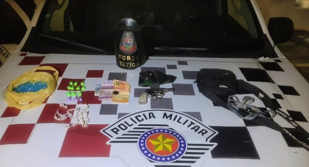 No local, foram encontrados 13 eppendorffs (pinos) de cocaína, 24 pedras de crack, um revólver calibre 22 e R$55,00 reais em espécie.