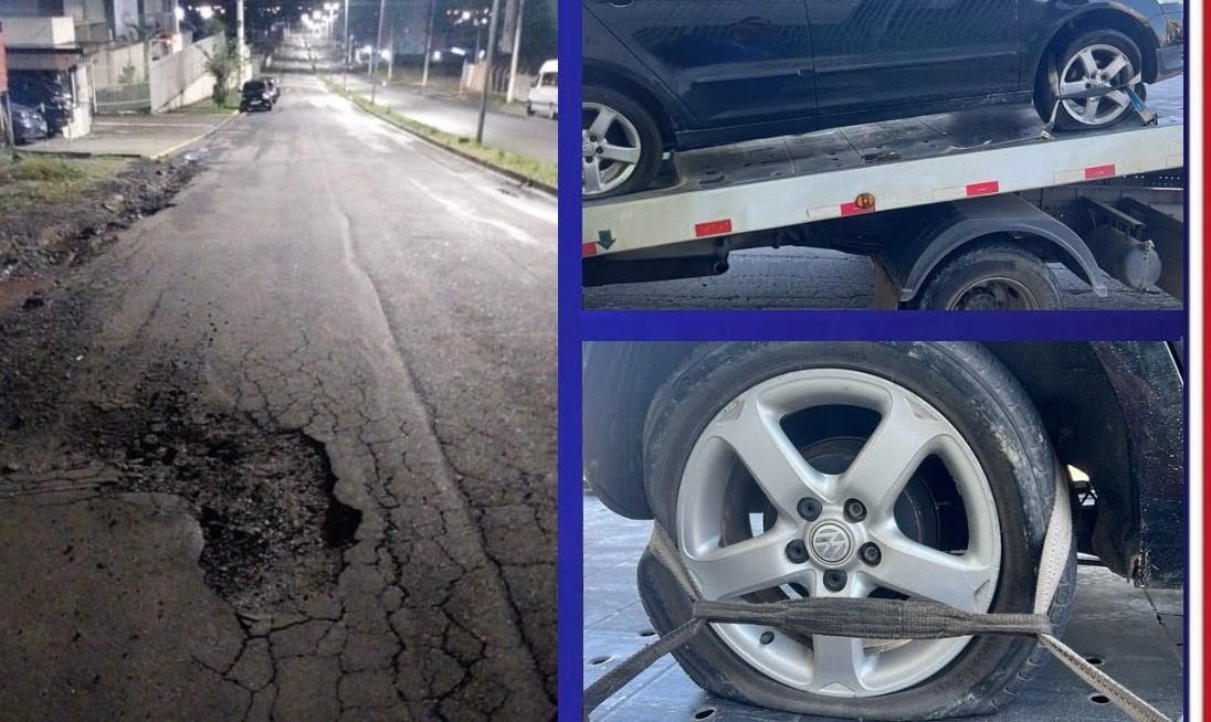Uma motorista viveu momentos de indignação após ter os dois pneus de seu veículo estourados ao passar por um buraco de grandes proporções na subida do Morrão, no bairro Jardim do Vale, em Guaratinguetá.