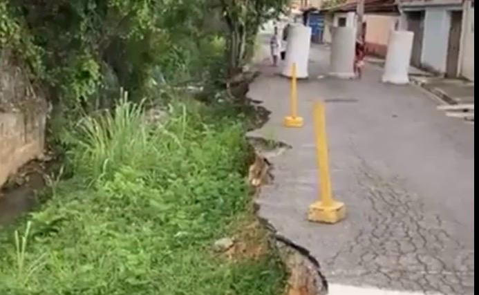 Após as fortes chuvas registradas nos últimos meses, parte da via cedeu nos dois lados do córrego Patury, provocando o desabamento do leito carroçável e bloqueando o acesso de veículos, o que tem causado transtornos diários para quem depende da rua.