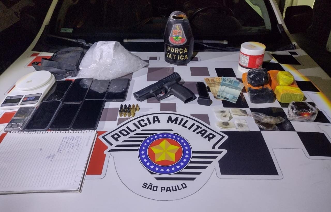 Além da arma, foram apreendidos mais de 1 quilo de maconha, porções de haxixe e cocaína, dinheiro em espécie, duas balanças de precisão, mil eppendorfs vazios, um caderno com anotações do tráfico e sete aparelhos celulares utilizados na atividade criminosa.