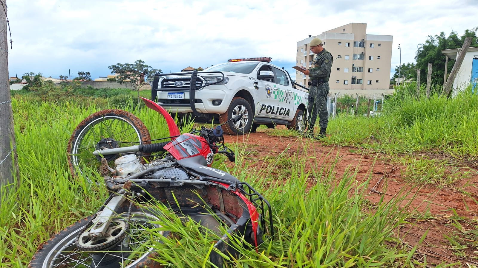 Durante patrulhamento preventivo pelo bairro Parque das Árvores, nesse domingo(15), a equipe da polícia militar ambiental, localizou na rua Kalil Francis próximo à estação de captação de água do Saeg, uma motocicleta XLR125 cor vermelha sem placa, não sendo localizado ninguém nas proximidades.
