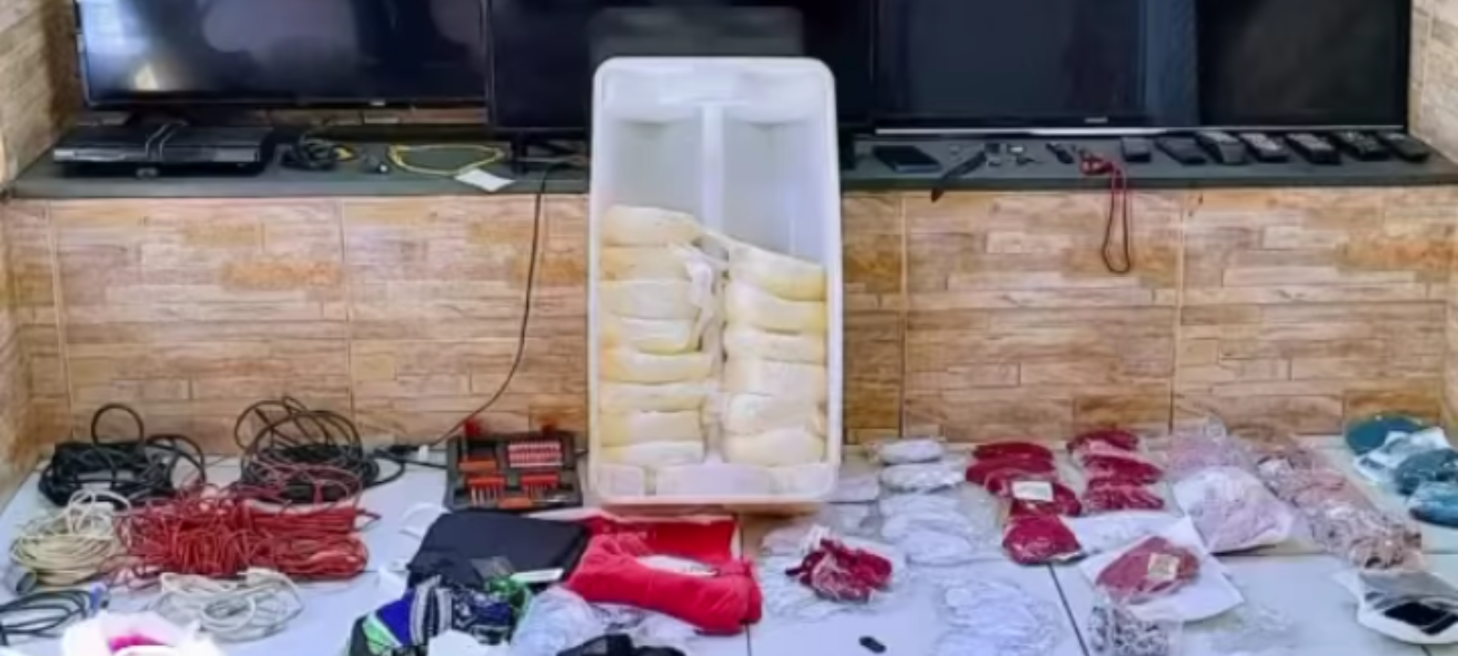 O suspeito foi localizado dentro do imóvel de sua companheira, que tinha uma medida protetiva contra ele. No local ainda foram localizados diversos eletrônicos, fiação elétrica, 16 peças de queijos, peças de carnes e demais objetos com queixas de furto.